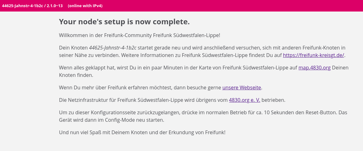 Mehrfach thematisiert, daher hier nur kurz: Firmwareupdates sind nur möglich von unserer Version 1.4.x auf 1.9.0 und erst von dort auf 2.0.0 — andere Vorgehensweisen¹ lehnen die Geräte in seltenen Fällen ab, führen leider aber latent eher zu einem ›Brick‹, also einem schicken neuen Türstopper in WLAN-Router-Form. Im besten Fall verliert der Knoten ›nur‹ seine Konfiguration und wartet im Config-Mode auf Angaben.
